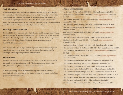 Those following the trail continued to increase in number during 2020, despite 1st Governor Arthur Mellette, 1889-1893 – fully funded; unveiled in 2012